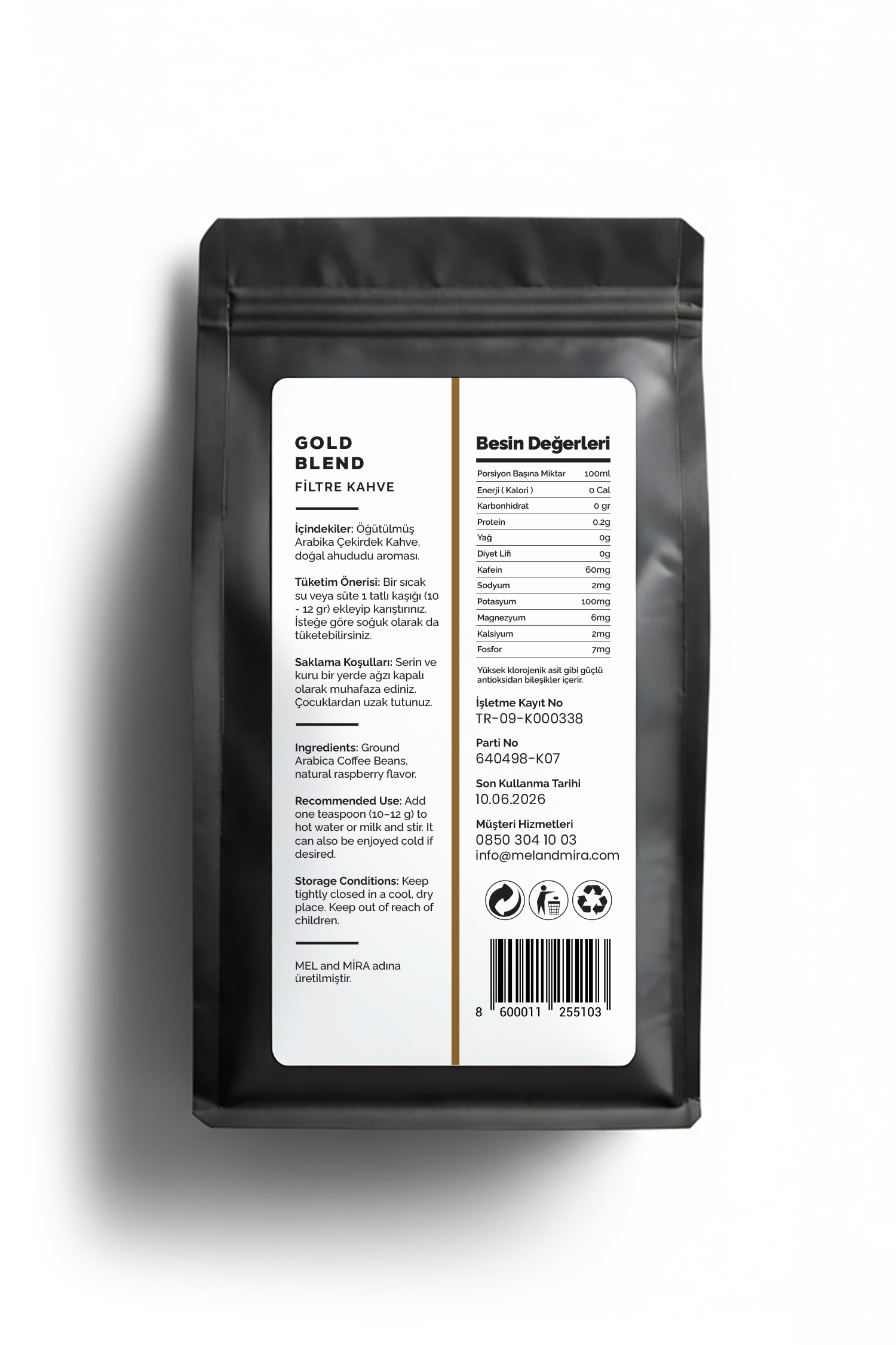 Mel & Mira Altın Karışım Filtre Kahve, özenle seçilmiş Arabica çekirdekleri ve özel harmanı ile zengin aromalı, dengeli ve aromatik bir filtre kahve deneyimi sunar. Güne enerjik ve keyifli başlamak için idealdir.