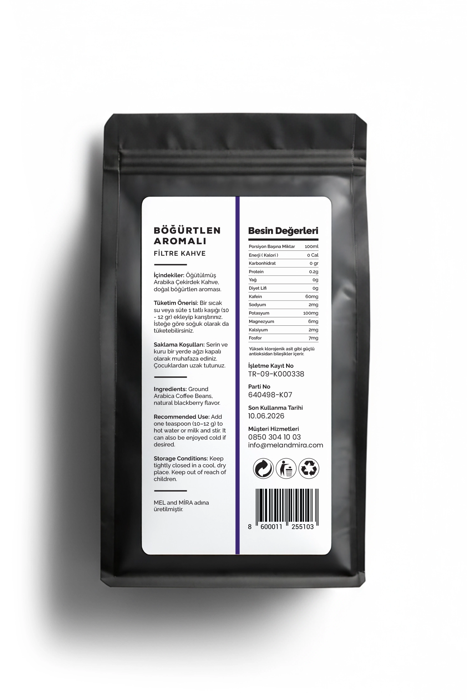Mel & Mira Böğürtlen Aromalı Filtre Kahve, özenle seçilmiş Arabica çekirdekleri ve doğal böğürtlen aroması ile tatlı, meyvemsi ve aromatik bir filtre kahve deneyimi sunar. Evde kafe kalitesinde bir içim isteyenler için idealdir.