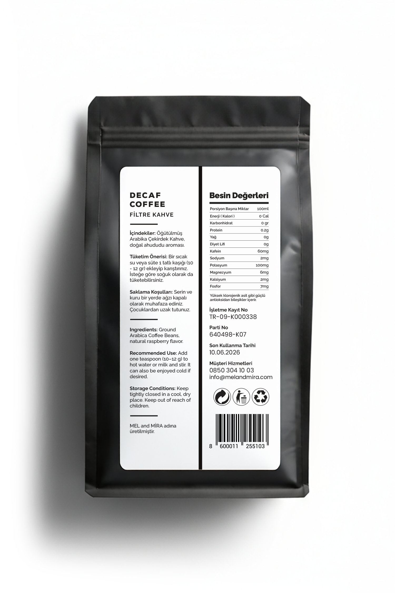 Mel & Mira Kafeinsiz Filtre Kahve, özenle seçilmiş Arabica çekirdekleri ve kafeinsiz özel işleme yöntemiyle yumuşak, aromatik ve berrak bir filtre kahve deneyimi sunar. Günün her saatinde keyifle tüketilebilir.
