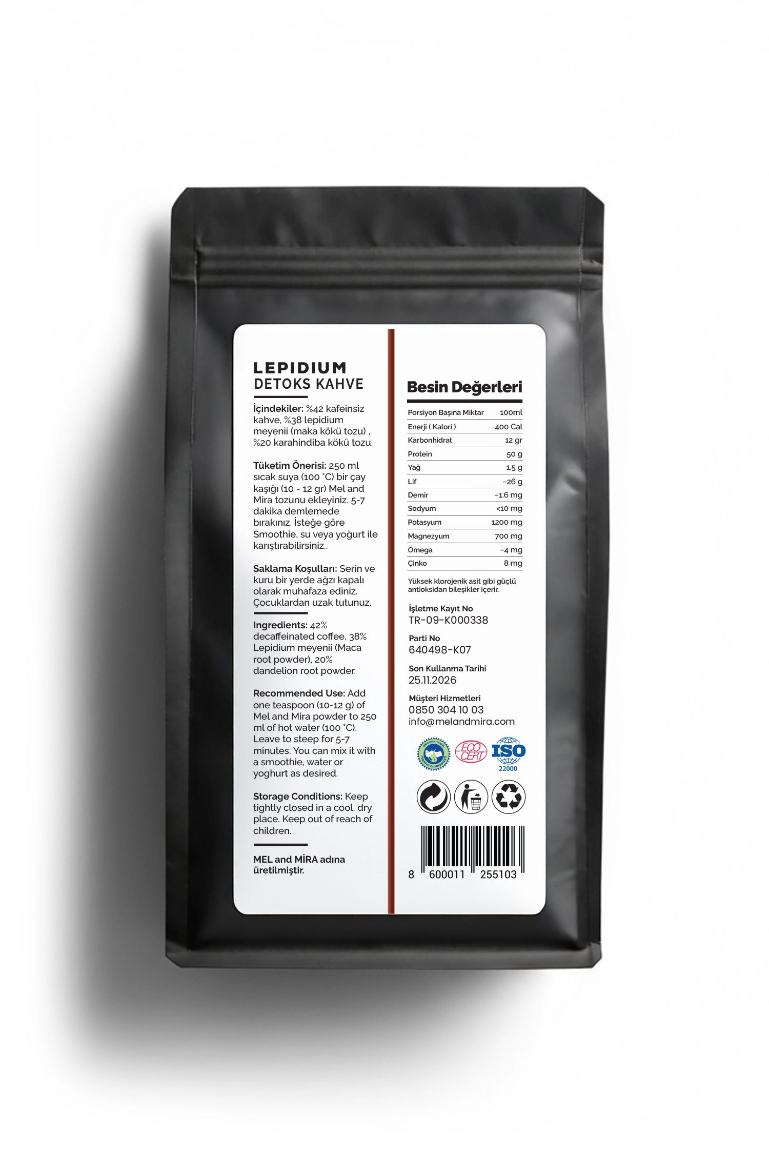 Mel and Mira Premium Detox Series Lepidium Kahve, çözünebilir kafeinsiz Arabica kahvesi ile Lepidium Meyenii (Maca kökü) içeriğini bir araya getirerek doğal enerji, hormon dengesi ve günlük detox desteği sunan fonksiyonel bir kahve karışımıdır. Ekipman gerektirmeyen yapısı ve yumuşak içimiyle modern yaşam temposuna sağlıklı bir dokunuş ekler.