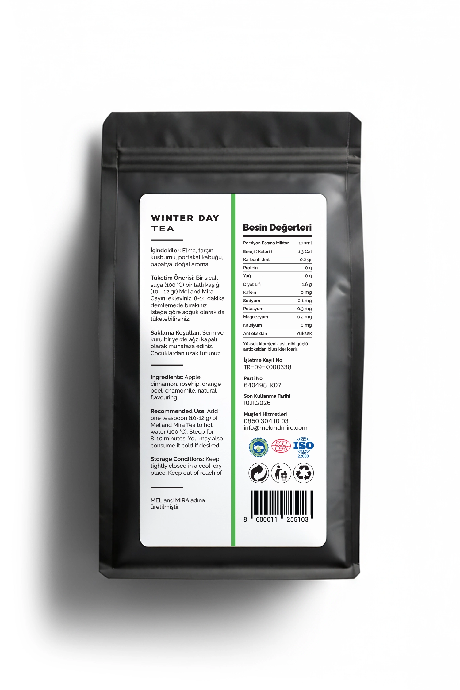 Mel and Mira Winter Day Çayı, soğuk kış günlerinde içinizi ısıtan aromatik ve doğal bir bitki çayı deneyimi sunar. Elma, tarçın ve kuşburnu ile harmanlanmış zencefil dokusu, portakal abuğu ve papatya ile birleşerek hem ferahlatıcı hem de rahatlatıcı bir içim sağlar. Günlük ritüellerinizde, sıcak ve soğuk olarak tüketebileceğiniz premium bir bitki çayıdır.
