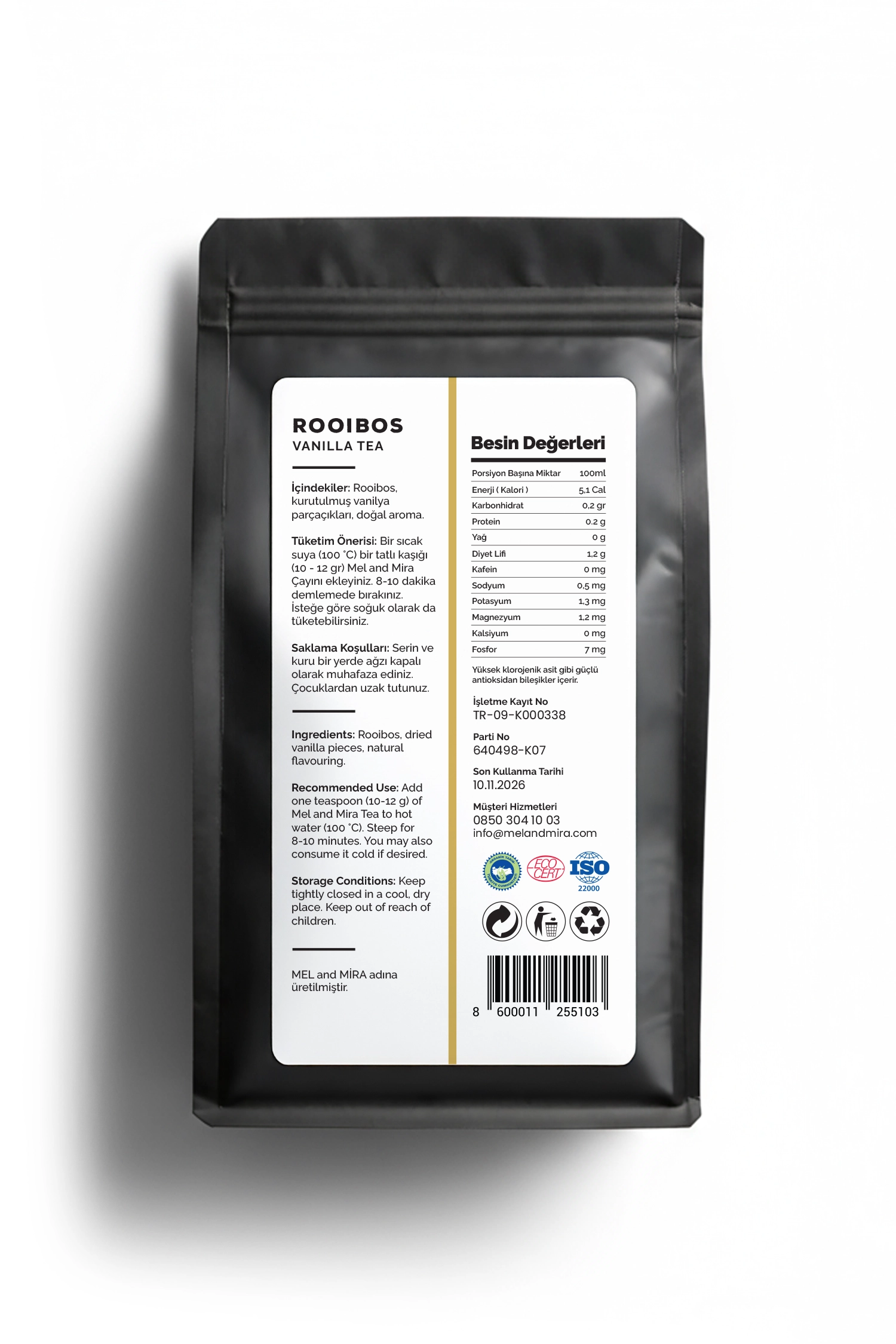 Mel and Mira Premium Vanilyalı Rooibos Çayı, %100 doğal Rooibos yaprakları ile saf vanilya aromasının birleşimiyle hazırlanmış premium bir bitki çayıdır. Kafeinsiz yapısı ve tatlı, yumuşak aroması sayesinde günün her saati tüketilebilir. Aromaterapik etkisiyle zihinsel rahatlama ve ferahlatıcı bir içim sunar.